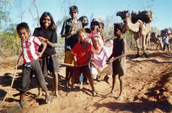 Judy Prosser with children from Pandanus Park Aboriginal Community on a walk with camels along the Fitzroy River.